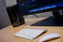Apple said that an Intel-based replacement for the 2003's PowerPC-based Power Mac G5 machines had been expected for some time before the Mac Pro was formally announced on August 7, 2006, at the annual Apple Worldwide Developers Conference (WWDC).[4] In June 2005, Apple released the Developer Transition Kit, a prototype Intel Pentium 4–based Mac housed in a Power Mac G5 case, that was temporarily available to developers.[5] The iMac, Mac Mini, MacBook, and MacBook Pro had moved to an Intel-based architecture starting in January 2006, leaving the Power Mac G5 as the only machine in the Mac lineup still based on the PowerPC processor architecture Apple had used since 1994. Apple had dropped the term "Power" from the other machines in their lineup and started using "Pro" on their higher-end laptop offerings. As such, the name "Mac Pro" was widely used before the machine was announced.[6] The Mac Pro is in the Unix workstation market.[7] Although the high-end technical market has not traditionally been an area of strength for Apple, the company has been positioning itself as a leader in non-linear digital editing for high-definition video, which demands storage and memory far in excess of a general desktop machine. Additionally, the codecs used in these applications are generally processor intensive and highly threadable, which Apple's ProRes white paper describes as scaling almost linearly with additional processor cores. Apple's previous machine aimed at this market, the Power Mac G5, has up to two dual-core processors (marketed as "Quad-Core"), but lacks the storage expansion capabilities of the newer design.[6]