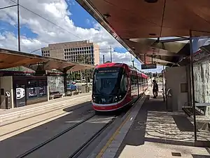Macarthur Avenue is a light rail station on the Canberra Metro R1 Civic to Gungahlin line, located at the intersection of Northbourne Avenue, Macarthur Avenue and Wakefield Avenue. This is a major intersection bordering the suburbs of Dickson, Braddon, Turner and Lyneham. Priority for light rail vehicles arriving and departing from the station has increased traffic congestion for vehicles waiting to cross Northbourne Avenue since the line began operating.[1] The station provides bicycle racks, however there are no "kiss and ride" or dedicated parking areas for commuters.[2]