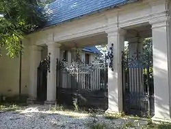 The Mackay Estate Gate Lodge was designed in 1899 and built between 1900 and 1902 by architect Stanford White of McKim, Mead & White in the French Baroque style. It is a small but imposing stone building with a central entrance flanked by small square lodges and topped by a steep slate mansard and pyramidal roof. The central vehicular entrance contains a wrought iron gate of elaborate design. The house was originally a component of Clarence Mackay's Harbor Hill Estate.[2]