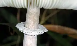 Cap: Around 15 cm wide, expanded with a wide umbo in the centre. The cap surface is white and smooth at the cap edges but cracking towards the centre whilst the umbo is brown with small warts. Gills: Free, broad and tan coloured from the spores but with colourless flesh when examined under a light. Stem: Around 18 cm tall and 2 cm thick running up into the flesh of the cap. Smooth and white and roughly equal in thickness across its length but with a bulbous base that is up to 4 cm thick. The stem is hollow but with slightly fibrous interior flesh. The persistent but movable stem ring is thick and large with membranous edges.[4]