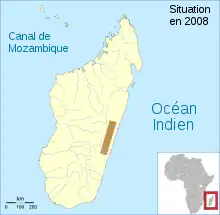 This species is endemic to Madagascar. It is present in the East-central Madagascar in upland locations from near Niagarakely south to Ranomafana, at an elevation of 700–1,050 metres (2,300–3,440 ft) above sea level.[2] It is threatened by habitat loss and it may be threatened by commercial collection.