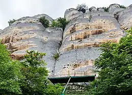The relief sculpture depicts a majestic horseman, approximately 23 m (75 ft) above ground level, carved into an almost vertical 100 m-high (328 ft) cliff. The sculpture is almost life-size.[3] The horseman, facing right, is thrusting a spear into a lion lying at his horse's feet, and on the left a dog is running after the horseman.[5] The carving of the horseman's halo and garments, as well as the bird in front of the horseman's face, are barely recognizable due to centuries of erosion and the generally poor condition of the monument.[6] The relief is similar to the carbon images found in Saltovo, Soulek, Pliska and Veliki Preslav.[1]