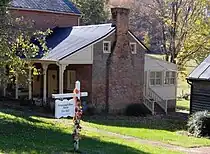 - An 1820s-era 16-foot (4.9 m) by 20-foot (6.1 m) slave cabin and detached kitchen, located almost adjacent to the main house's ell wing. The cabin's walls are made of sawn timber, and the cabin rests on a mixed brick and stone foundation.[1]