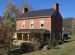 The Maden Hall farmhouse is a two-story Federal-style brick house with a 1.5-story ell and a 1-story kitchen wing. The main wing of the house measures 33 feet (10 m) by 22 feet (6.7 m), and the ell measures 16 feet (4.9 m) by 25 feet (7.6 m). The kitchen wing, added to the east side of the house in the 1970s, measures 16 feet (4.9 m) by 37 feet (11 m). The bricks of the original portions of the house were laid in Flemish bond, whereas the bricks of the new kitchen wing were laid in common bond. The house's gable roofs were originally covered with wooden shingles, but these have been replaced by seam metal panels.[1]