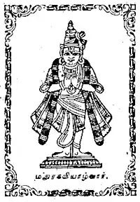 Madhurakavi was born before Nammalvar, in a Brahmin family, in the month of Chittirai and in chitra star in Thirukkolur near Alwarthirunagari.[2][3] The presiding deity in the temple is called Vaitha Maanidhi, meaning the storage of great wealth. He is believed to be the divine form of Kumudha Ganesa, the disciple of Vishvaksena, a servant of Vishnu. He is also believed to be the incarnation of Garuda, the sacred eagle vehicle of Vishnu.[4] Though some believe that he is an incarnation of Garuda, some accounts show that he is the incarnation of Kumuda, Vishvaksena's disciple, while Nammalvar himself is the incarnation of Vishvaksena (Vishvaksena is the commander in chief of Vishnu's army). Madhurakavi Alvar lived during the lifetime of Nammalvar (Vishvaksena's incarnation).