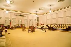 It is a three-story building with four colossal columns in its front facade, with its three main entrances set back from them. It is 112 by 182 feet (34 m × 55 m) in plan and has a large, 1200-plus seat auditorium in its rear section.[3]