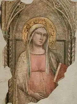 A Madonna del Parto ("Madonna of Parturition") is an iconic depiction of the Virgin Mary shown as pregnant, which was developed in Italy, mainly in Tuscany in the 14th century. Examples include works by Taddeo Gaddi, Bernardo Daddi and Nardo di Cione, but the fresco by Piero della Francesca in the Museum of Monterchi, in the province of Arezzo, is considered the most famous one. The Madonna was portrayed standing, alone, often with a closed book on her stomach, an allusion to the Incarnate Word. These works were associated with the devotions of pregnant women, praying for a safe delivery.[1] Sometimes, as with a statue by Sansovino in the Basilica of Sant'Agostino in Rome, the depiction is of a Virgin and Child, which was however known as a Madonna del Parto, because it was especially associated with devotions related to pregnancy. Here the Virgin wears the Girdle of Thomas, a belt of knotted cloth cord that was a relic held in Prato Cathedral, which many versions show her wearing.