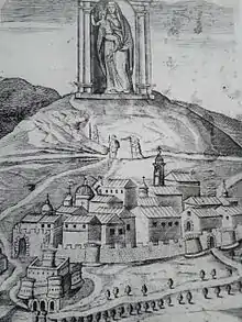 The cult is related to the presence of the medieval town of Pietra Aquaria (literally "water stone") on the top of Mount Salviano since the 10th century. Here, as attested by Pope Clement III's 12th century bull, there were three small religious buildings: Saint Peter, Saint John and Saint Mary.[3] In this church a painting depicting the Virgin with Child was located.[4][5]