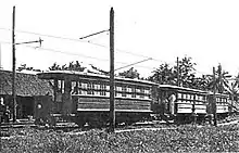 The Mae Klong Railway was built in two separate stages. The Tachin Railway Ltd, founded in 1901 with a concession from the crown of Thailand to construct a line to Samut Sakhon from Bangkok,[6] built the 33 kilometer Mahachai Line; it opened in 1904 with eight stations. A year later, The Maeklong Railway Company opened the 34 kilometer Ban Laem Line, using three steam locomotives.[7][5] The lines merged in 1907 to form the Maeklong Railway Ltd. It was originally opened as a goods line, transporting produce from the fishing ports of Samut Sakhon and Samut Songkram to the Bangkok markets.[3] The Government of Thailand purchased the now-merged company in 1926 and electrified the eastern section, turning it into an interurban tramway.[8] The Thai military later gained control of the railway in 1942, during World War II, and the line was brought under the control of the State Railway of Thailand in 1952 and fully merged into it by 1955.[9][5] During this period of merger, the electrification was removed from the eastern section, with steam-hauled and later diesel-hauled trains replacing the old tramcars in 1959.[7] In 1961 the line's original terminus at Pak Khlong San was closed and replaced with a bus stop, to ease traffic congestion in Bangkok, with Wongwian Yai becoming the new terminus.[5]