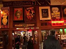 A magic shop in Seattle, displaying posters of famous magicians and also advertising "gags"