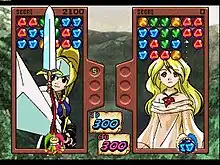 One notable addition is the introduction of character-specific special power-up items, of which there are three that gives the players unique abilities during gameplay.[1][2][3][4][5] The game replaces adventure mode from Magical Drop III with a role-playing (RPG) mode; the player controls Justice on a journey to find seven Magical Drops scattered across the land, traveling villages and challenging characters in battles to obtain items and power-ups.[1][2][3][4][5] The game is over once a player is defeated when the stack of drops hits the bottom.