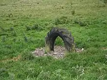 The scholar of English literature Marion Thain, writing in Worldviews, calls "The Tyre" the poem which most clearly explores Armitage's thoughts about the borderland between city and countryside, Marsden being in her view just such a place. She notes that the scholar and critic Raymond Williams describes the car as embodying humanity's current relationship with the world, and argues that the tyre symbolises the interface between urban and rural, as well as the division between the two cultures.[lower-alpha 1] The poem tells of finding a tyre on the moor "Lashed to the planet with grasses and roots". The narrator and the other children prise it free and make it roll. It bounds on to the road and rushes down to the village; they imagine "a phone-box upended, children erased, police and an ambulance in attendance," but when they arrive, they find no trace of it. The poem ends, she writes, with the children accepting a supernatural explanation for the tyre's disappearance. Thain notes that Armitage's semi-autobiographical 1998 travel book All Points North gives more detail of the tyre: "we must have tripped right over it, because it was sewn to the earth with tuft-grass and rushes, and the stitching had to be unpicked before we could prize it out of the peat and lift it up." The travel book, too, describes the tyre as "the giant vulcanized beast we'd brought to life", and tells how it crossed a main road, the A62, "between two wagons going at sixty miles an hour in opposite directions." Thain comments that the tyre is "ostensibly" back in the urban world of motor traffic, but is from the alarmed drivers' point of view "a beast run wild". The children wonder if they will find it, inanimate, "embedded in a house", or living, "lying in the gutter, playing dead". In her view, Armitage manages to "[marry] innocent and adult viewpoints" in his "allegory turned fairytale", avoiding closure and so connecting the geographic borderland with the natural/supernatural borderland of the poem.[13]