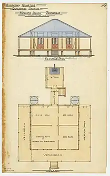 In 1875, the island was set aside as a quarantine station although it took another ten years for the proper facilities to be set up at West Point. In November 1884 the Queensland Government accepted a tender from Leisner and Sparre to construct the quarantine station for £3645.[9] It was only after the tender was accepted that the site on West Point on the north-west was actually chosen.[10]