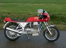 Magni wanted to produce an "all Italian" machine and turned to Moto Guzzi for a supply of engines. The first Guzzi engined machine was the Magni-Guzzi LeMans 1000, using the engine from the Le Mans 1000. A new frame was designed, which had similarities to the Lino Tonti designed Moto Guzzi item. Magni introduced the "parallelogram" rear suspension,[33] previously used on the 1950 shaft drive MV Agusta 500 cc GP machines,[35] which negated the torque reactions of the shaft drive and made the handing more predictable.[30][36] (A parallelogram kit was made available to upgrade the rear suspension of Moto Guzzi models)[37]