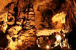 The total length of the 15 million year old cave is 2.5 km (1.6 mi).[3] The average annual temperature of the cave is 12 °C (285 K; 54 °F), except for one room where the temperature is always 15 °C (288 K; 59 °F). The air humidity reaches 80% and the displacement - 56 m (184 ft). The Magura cave was formed in the limestone Rabisha Hill (461 m (1,512 ft) above sea level). The morphology of the cave consists of one main gallery with six various-sized halls and three lateral galleries around it.[4] The main gallery is composed of six chambers, variously sized; the largest one, the so-called Arc Hall, is 128 m (420 ft) long, 58 m (190 ft) wide and 21 m (69 ft) high, including impressive natural vaults, speleothems, spectacular stalactites and stalagmites, named The Poplar, The Pipe Organ, The Oriental City and The Cactus. The very spacious site also allows for music concerts to be held during Christmas and Easter.