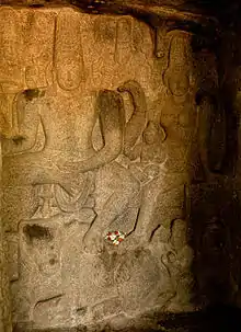 The north wall in the cave contains a relief depicting the battle scene of the two adversaries, goddess Durga and the demon buffalo-headed Mahishasura. This panel symbolizes the triumph of good over evil. The carving is considered one of the best creations of the Pallava period. In the war scene, Durga appears with eight hands riding a fierce-looking lion. She is holding a khadga (sword), dhanush (bow), bana (arrows), ghanta (bell) in her four right hands; her four left hands display pasa, sankha, and dagger. An attendant holds a chatra (parasol) over Durga's head. She is in the battlefield with her army of female warriors and ganas (dwarfs). She is shown attacking, with arrows, the demon Mahisha, causing him to retreat with his followers. Mahishasura is armed with a gada (club).[11] Mahishasura's legend is told in the major texts of the Shaktism traditions known as the Devi Mahatmya, which is part of Markandeya Purana. The story of Mahishasura is told in the chapter where Markandeya is narrating the story of the birth of Savarnika Manu. Per the Markandeya Purana, the story of Mahishasura was narrated in the second Manvantara (approximately 1.3 billion years ago, as per the Vishnu Purana) by Maharishi Medha to a king named Soorut, as an incident which occurred in times ancient for even the 2nd Manvantara. Mahishasura is described as an evil being who can change his outer form, but never his demonic goals. According to Christopher Fuller, Mahishasura represents the forces of ignorance and chaos hidden by outer appearances.[13][14] The symbolism is carried in Hindu art found in South Asia and South-East Asia (e.g., Javanese art), where Durga is shown as a serene, calm, collected and graceful symbol of good as she pierces the heart and kills the scared, overwhelmed and outwitted Mahishasura.[15][14]