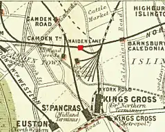 This Maiden Lane station - 51°32′27″N 0°07′37″W / 51.540917°N 0.127051°W / 51.540917; -0.127051 - was a short distance northwest of the Great Northern Railway station and near the present High Speed 1 tunnel portal. It also served King's Cross Goods Yard. It closed in 1916 [2] or 1917,[3] after the LNWR in 1916 electrified the southern pair of the four tracks for passenger services, leaving the northern pair, on which the station was built, solely for steam-hauled goods traffic.