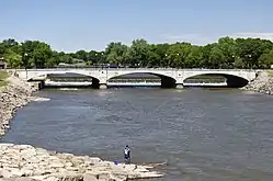 The Main Street Bridge is a historic structure located in Charles City, Iowa, United States. It spans the Cedar River for 248 feet (76 m).[2] Before a bridge was built at this location local citizens would cross the river by way of a ferry, at a ford in summer, and across the ice in winter. The first bridge at this location was washed away in a flood while it was under construction in 1858. The second bridge was completed in 1864, and it was destroyed in a flood two years later. A temporary bridge was completed in 1867, and it was replaced by a truss bridge in 1870. It was used for 40 years despite an engineer's study in 1892 that suggested it be condemned.[2] The Floyd County Board of Supervisors approved a replacement bridge in 1908. The old bridge was moved to a new spot five blocks downstream, but contract problems delayed construction of the new bridge. Advance Construction Company of Waukesha, Wisconsin was finally awarded a contract in March 1909. The three span concrete filled spandrel arch bridge was designed by their designing engineer G.W. Miller. It was completed in 1910 for about $40,000, which was paid for by the county and the city.[2] The bridge was listed on the National Register of Historic Places in 1999.[1]