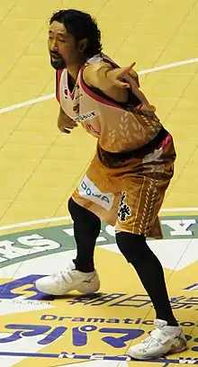 Makoto Hasegawa (長谷川誠, born 2 April 1971) is a Japanese basketball coach and a former player.[6] Hasegawa was the head coach of Akita Northern Happinets.[7] He is the first Japanese player ever to play in the American Basketball Association. Because of his trademark bushy goatee, his nickname is "hige" in Akita.[8] He played for Kosei Club and Akita Northern Bisons as an amateur in his home prefecture.[9][10][11] Currently he serves as an unaffiliated director of the Akita Happinets and the Japan national 3x3 team coach.