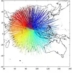 An analysis of the time difference between the transmission of the ping and the aircraft's response allowed Inmarsat to determine the aircraft's distance from the satellite. This resulted in two arcs—referred to as the "northern corridor" and "southern corridor"—where the aircraft may have been located at the time of its last complete handshake at 08:11.[48] Using an "innovative technique"[15] that has "never before [been] used in an investigation of this sort",[49] the team determined it could also use the burst frequency offset to determine the aircraft's speed and position along the identified arcs. Inmarsat cross-checked its methodology to known flight data from six Boeing 777 aircraft flying in various directions on the same day, and found a good match.[13] Applying the technique to the handshake signals from Flight 370 gave results that correlated strongly with the expected and actual measurements of a southern trajectory over the Indian Ocean, but poorly with a northern trajectory.[13][15][50] Further revised calculations to account for movements of the satellite relative to the earth allowed the northern corridor to be ruled out completely. This analysis was passed on to Malaysian authorities on 23 March.[6]