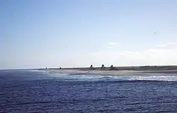 A continuous heavy surf falls all along the coast, forming a narrow white to gray sandy beach. Except on the west coast, where the white sandy beach is more extensive than elsewhere, a strip of dark gray coral rubble, forming a series of low ridges parallel to the coast, lies within the narrow beach, extending inward to the island rim.[3]