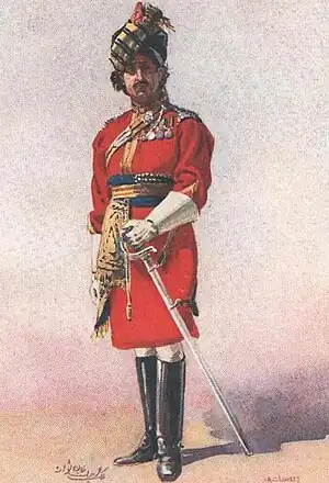 Sir Malik Umar Hayat Khan as an Honorary Lieutenant of the 18th King George's Own Lancers, early 20th century (watercolour by Major A.C. Lovett (1862-1919)).