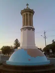 At Mallala's centre is a World War I war memorial in the centre of the intersection of eight roads. Its insignia reads: 'In honour of ten men who died in defence of home and liberty' in memory of ten local men who were killed in Egypt, France and Palestine.[8] The memorial consists of a base made of ten granite stones in each step of the base topped with ten arched stones to form a hemisphere showing a map of Australia. The hemisphere supports a ten-sided column the names of the ten soldiers which is topped by ten marble pillars and a plinth displaying the Cross of Sacrifice. The history of the ten soldiers and the broader service history of the district forms a major collection at the Mallala Museum.