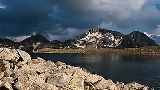 Malokamenishki Lakes are among the largest lake groups in Pirin by number. They are situated at altitudes between 2,537 m and 2,190 m. Two of the lakes have an area of over 10,000 m2, seven between 1,000 and 10,000 m2 and the rest under 1,000 m2. Most of them are swallow and dry out in summer.[3] The highest eleven lakes are scattered in the folds of the Belemeto cirque centered around the eight lake, Tevnoto. Most of them have unreliable water flow and an area under 1,000 m2.