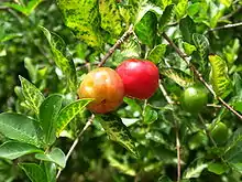 Malpighia is a genus of flowering plants in the nance family, Malpighiaceae. It contains about 45 species of shrubs or small trees, all of which are native to the American tropics.[2] The generic name honours Marcello Malpighi, a 17th-century Italian physician and botanist.[3] The species grow to 1–6 m (3.3–19.7 ft) tall, with a dense, often thorny crown. The leaves are evergreen, simple, 0.5–15 cm (0.20–5.91 in) long, with an entire or serrated margin. The flowers are solitary or in umbels of two to several together, each flower 1–2 cm (0.39–0.79 in) diameter, with five white, pink, red, or purple petals. The fruit is a red, orange, or purple drupe, containing two or three hard seeds. M. emarginata is cultivated for its sweet and juicy fruits, which are very rich in vitamin C.[4]