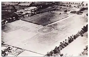 Wythenshawe Aerodrome in 1929 looking north-east. The small hangar is at top right. Wythenshawe Road slants down from centre right. 'M/C' in the middle of the airfield indicates 'Manchester' to pilots. The lane going across the top right corner is now Rackhouse Road.