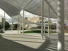 A "focal point" of the design is the Grand Canopy, a structure of swooping curves that surrounds the museum.[9] Described as a "perforated aluminum and steel roof that creates textured light and shadows throughout the grounds", it was inspired by the geometry of the farm fields that surround Davis.[9]