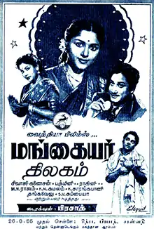 Mangaiyar Thilakam (transl.A Jewel Among Women) is a 1955 Indian Tamil-language drama film directed by L. V. Prasad. The film, released on 26 August 1955, was a remake of the 1953 Marathi film Vahinicha Bangadya.[1] The film was produced by Sripadha Shankar under the banner of Vaidya films. It stars Sivaji Ganesan and Padmini, while M. N. Rajam, S. V. Subbaiah, K. A. Thangavelu and K. Sarangapani play pivotal roles. The film's soundtrack and background score were composed by S. Dakshinamurthi, while the lyrics for the songs were written by Kannadasan, Puratchidasan, and Maruthakasi. P. L. Rai and N. M. Shankar handled cinematography and editing respectively. The story was adapted by Sadasiva Brahmam and dialogues were written by Valampuri Somanathan, G. Ramakrishnan and D. Nagalingam.