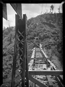 A further 1.83 km (1.14 mi) north of the workshop, the 198 yd (181 m) long Makōhine tunnel was finished in 1894, after 14 months of construction, allowing the rails to reach the edge of the Makōhine gorge, for easy access to the viaduct site.[26] The lining of the tunnel was completed in August, except about 15ft kept open to enable the men to run the cutting to spoil.[13] It was 16 ft 10 in (5.13 m) high and 10 ft 4 in (3.15 m) wide (at the bottom). The walls were thick concrete, with an arch of concrete blocks. It was constructed by co-operative labour, who suffered no accidents.[27] However, a mother and four children died when a spoil heap from the tunnel cutting collapsed on them.[28] The tunnel was daylighted in 1984, prior to electrification.[1]