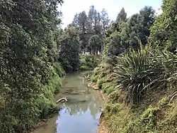 The reserve 18.5 ha (46 acres) of kahikatea forest on the east bank of the river, was purchased by the Native Forests Restoration Trust in 2001. Kahikatea forest once covered 41,000 ha (100,000 acres) in the Waipa Ecological District, now reduced to 158 ha (390 acres), of which 52 ha (130 acres) are in the Mangapu valley, though over 70 ha (170 acres) has been felled since 1975.[11] A major drainage scheme was carried out just upstream from the reserve in the 1930s, including emptying of a lake.[12] The forest floods in winter[13] and flood protection would be uneconomic.[14] Some kahikatea in the reserve are about 120 years old. The reserve also has swamp maire, mataī, tītoki and pukatea.[11] Te Araroa long-distance walkway passes through the reserve and crosses the river on a suspension bridge.[15]