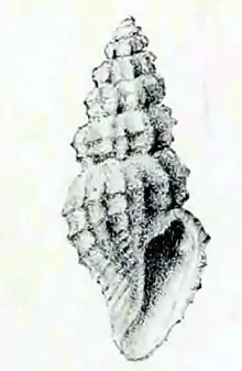 This is a solid white shell with a short fusiform shape. It contains 8 whorls of which 2½ smooth, vitreous whorls in the protoconch. The subsequent whorls are much impressed at the suture. They contain a few axial ribs, crossed spirally by angulate lirae (eight lirae in the body whorl). The narrow aperture is oblong. The outer lip is incrassate. The columella is simple.[1]