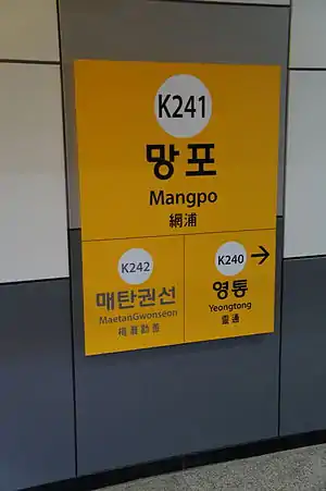 Mangpo Station is a subway station of the Suin–Bundang Line, the commuter subway line of Korail, the national railway of South Korea.