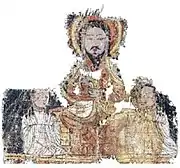 The picture on the flag banner is divided into upper and lower layers, and the upper layer image area is about one-half of the lower layer. On the lower front, there is a portrait of a Manichean female believer standing on a felt carpet. She embraces a book inlaid with gold, is dressed in a white robe, a white headscarf and a white top hat, which shows that she is an elector. There are two huge lotus buds floating on the left of the voters. On the upper right side is a frame similar to the circle of ancient Egyptian kings. Inside the frame is a Uighur written in Sogdian alphabet: "Portrait of Princess Busuš".[2]: 270 Below the frame is a portrait of a female layman in a crimson robe, one-half the size of the voter's portrait. On the upper floor is painted a seated female god with a white crown and white robe sitting on each side; the golden ring-shaped crown of the god is decorated with the symbol of light, and a circle of small heads wearing the same symbol of light is suspended above the head. It depicts the Light Maiden. Originally depicted on the back was a portrait of a Manichean male voter, who was later repainted as a female layman, but the male voter's white crown and two moustaches on his lips are still faintly visible.[2]: 271 This layman also stood on the felt carpet, wearing a crimson robe with black floral ornaments. She combed three large buns on her hair, a bun on the top of her head, two buns on the back of her head, and a floral ornament on the bun on top of her head. A lotus flower bud floats near the face on the left side, and a child raising his left hand is on the lower left side. On the upper floor is painted a sitting statue of a male god, with a slightly smaller voter sitting on each side, kneeling on each side. According to the description on the flag banner, this image is a statue of Jesus (Manichean translation "Yi Shu").[2]: 337