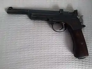 The Modelo 1905 is a pistol designed by Ferdinand Ritter von Mannlicher in 1899 and originally produced in Austria as the Mannlicher Model 1901.[2] The Mannlicher Model 1901 was an improved version of the Model 1900, both of which were produced by Österreichische Waffenfabriks-Gesellschaft (commonly known as Steyr). All of these models have the same basic design and operation, but minimal adjustments were made to improve each of them. The Modelo 1905 is the version of the Model 1901 that the Argentine Army purchased from Steyr in 1905. This semi-automatic pistol has a unique and elegant appearance due to the curve of the handgrip.[3] It is single action and uses a blowback operation system to reload. Like its predecessors, the Modelo 1905 has a non-detachable magazine that can be loaded from the top with a stripper clip.