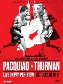 Manny Pacquiao vs. Keith Thurman, was a boxing match for the WBA (Super) welterweight championship.[2] The event took place on July 20, 2019 at the MGM Grand Garden Arena in Las Vegas, Nevada. Pacquiao won the fight by split decision, and at 40 years old, became the oldest welterweight to win a major world title in boxing history.[3] The bout sold 500,000 pay-per-view (PPV) buys in the United States,[4] earning an estimated $37.5 million in pay-per-view revenue.
