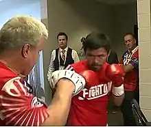 After Thurman's fight with Josesito López, he publicly said he wanted to fight Pacquiao next.[5] It was initially thought that Errol Spence Jr. would be next on Pacquiao's list when he came up the ring after Spence easily disposed of Mikey Garcia. It had also been rumored that Pacquiao would be facing Thurman next and Spence would instead have a unification bout with Shawn Porter.[6] On May 11, 2019 it was announced that Pacquiao–Thurman would happen on July 20, 2019 and a few days after, MGM Grand Garden Arena announced that they would be hosting the fight.[7] Betting odds started in favor of Thurman but slowly went Pacquiao's way as the fight drew closer.[8] Throughout the promotion, Thurman had nice things to say about Pacquiao being a legend as a sign of respect and would follow it up with how he planned on finishing Pacquiao's career.[9]