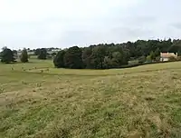 Centre: Site of Silverton Park in 2014, now overgrown with trees, viewed from south-east.[1] Left: (west), surviving red-brick stable block; Right (east): modern thatched cottage-orné named "Combe Satchfield", the original name of the estate