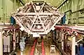 At the SSPF, ISS modules, trusses and solar arrays are prepped and made ready for launch. In this iconic building are two large 100,000 class clean work environment areas.[27] Workers and engineers wear full non-contaminant clothing while working. Modules receive cleaning and polishing, and some areas are temporarily disassembled for the installation of cables, electrical systems and plumbing. Steel truss parts and module panels are assembled together with screws, bolts and connectors, some with insulation. In another area, shipments of spare materials are available for installation. International Standard Payload Rack frames are assembled and welded together, allowing the installation of instruments, machines and science experiment boxes to be fitted. Once racks are fully assembled, they are hoisted by a special manually operated robotic crane and carefully maneuvered into place inside the space station modules. Each rack weighs from 700 to 1,100 kg, and connect inside the module on special mounts with screws and latches.[28]