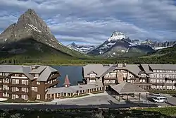 Many Glacier Hotel is a historic hotel located on the east shore of Swiftcurrent Lake in Glacier National Park in the U.S. state of Montana. The building is designed as a series of chalets, up to four stories tall, and stretches for a substantial distance along the lakeshore. The building has a Swiss alpine theme both on the outside and on the inside. The foundation is made of stone, with a wood superstructure. The outside is finished with brown-painted wood siding, and the window framing and balconies have wood sawed in Swiss jigsawed patterns. On the inside, the four-story lobby is surrounded by balconies, whose railings are patterned after Swiss designs.