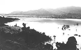 Mapanuepe lake is located at the confluence of Marella and Mapanuepe Rivers as the two rivers merge to become the Santo Tomas River. The subsequent rains following the 1991 eruption of Mount Pinatubo produced lahar that dumped volcanic debris on the Marella River, one of the major drainages of the mountain, aggrading the river that eventually dammed the Mapanuepe River. The rising waters submerged the Mapanuepe Valley including the barangays of Aglao (lower), Buhawen and Pili of San Marcelino, Zambales. During the development of the lake, breaching and reforming of the debris dam occurred following each lahar episode. At its maximum extent, the lake grew to an area of 670 hectares (1,700 acres) and had a stored water volume of 75 x 106 cubic meters (98,000,000 cu yd) before reaching its current state. The only structure that remains is a church tower with a huge metal cross right in the middle of the lake.[3] Prior to the 1991 eruption, studies of geologic formations and sediments of Mapanuepe Valley showed that the area was the site of a similar lahar-formed lake from old eruptions.[2]
