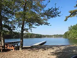 Camp Kiwanee, a former Camp Fire camp, is located on the southeastern shore of the pond. The town now owns the camp and rents camping and cabins as well as Needles Lodge for functions. The Rainbow Girls own land on the southwest shore and previously operated a summer camp there.
