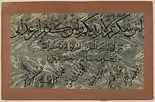 This calligraphic panel features a verse from the Qur'an (14:7), and is typical of compositions written upon marbled paper produced after the 16th century in Central Asia, Iran, India, and Turkey.[3]
