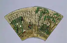 An example of suminagashi paper used as an element in traditional ink wash painting. From the National Treasure Fan-shaped album of the Hokekyō Sutra (Lotus Sutra), Heian period 12th c. CE, currently kept in the Shitennō-ji Temple in Osaka