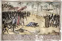 Marcellino d'Atri's memoirs[lower-alpha 1] were an Italian version of his previous memoirs in Portuguese, which had been lost when his ship was captured on the way to Italy. They give much useful information about the Kongo at that time, although flawed by his lack of understanding of the local cultures.[1] Marcellino wrote an account of a sangamento he had witnessed in 1696.[7] This was a ceremonial martial dance in which the temporal and religious rulers displayed their power and the ordinary people paid homage.[8] He described the political situation and the efforts of the missionaries to help Pedro IV reunify the country. He gave many Kongo language terms, described tropical fruits and medicinal plants, and described the effects of the slave trade. He betrayed typical European prejudice about the African people, whom he thought were barbaric, liars, thieves, lustful and ungrateful.[1]