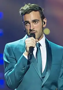 Marco Mengoni (Italian pronunciation: [ˈmarko meŋˈɡoːni]; born 25 December 1988) is an Italian singer-songwriter who rose to fame in 2009, after winning the third season of Italian talent show X Factor.[1] Since that he has sold over 2.8 million records in Italy, peaking the Italian albums chart seven consecutive times and entering the Top 10 Italian Singles Chart fifteen times.[2][3] He won the Sanremo Music Festival in 2013 and again in 2023, therefore representing Italy in the Eurovision Song Contest in both years, respectively.