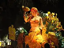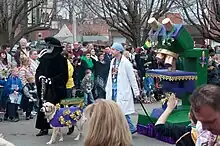 Mobile first celebrated Carnival in 1703 when French settlers began the festivities at the Old Mobile Site.[12] Mobile's first Carnival society was organized in 1704, when Nicholas Langlois founded Société de Saint Louis.[13] In 1711 it was renamed the Boeuf Gras Society (Fatted Ox Society) (1711–1861).[14] In 1830 Mobile's Cowbellion de Rakin Society was the first formally organized and masked mystic society in the United States to celebrate with a parade.[12][15] The Cowbellions got their start when Michael Krafft, a cotton factor from Pennsylvania, began a parade with participants' carrying rakes, hoes, and cowbells.[15] The "Cowbellions" introduced horse-drawn floats to the parades in 1840 with a parade entitled, "Heathen Gods and Goddesses".[14] The Striker's Independent Society was formed in 1843. It is the oldest surviving mystic society or krewe in the United States.[14]